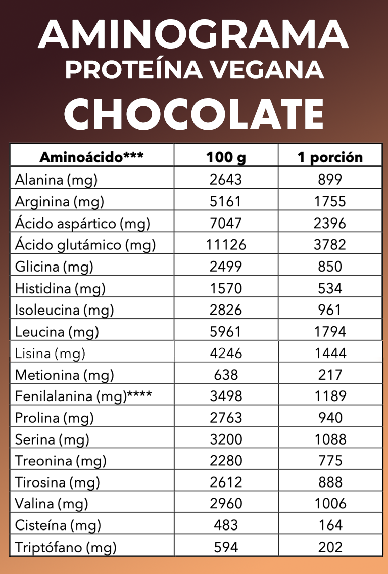 Proteína de arveja, aislado de proteína de soya, saborizante artificial e idéntico al natural, dióxido de silicio amorfo, cacao alcalino, ESTEVIA, SUCRALOSA, inulina (Cichorium intybus L.), cianocobalamina (Vit. B12) y ergocalciferol (Vit. D2).