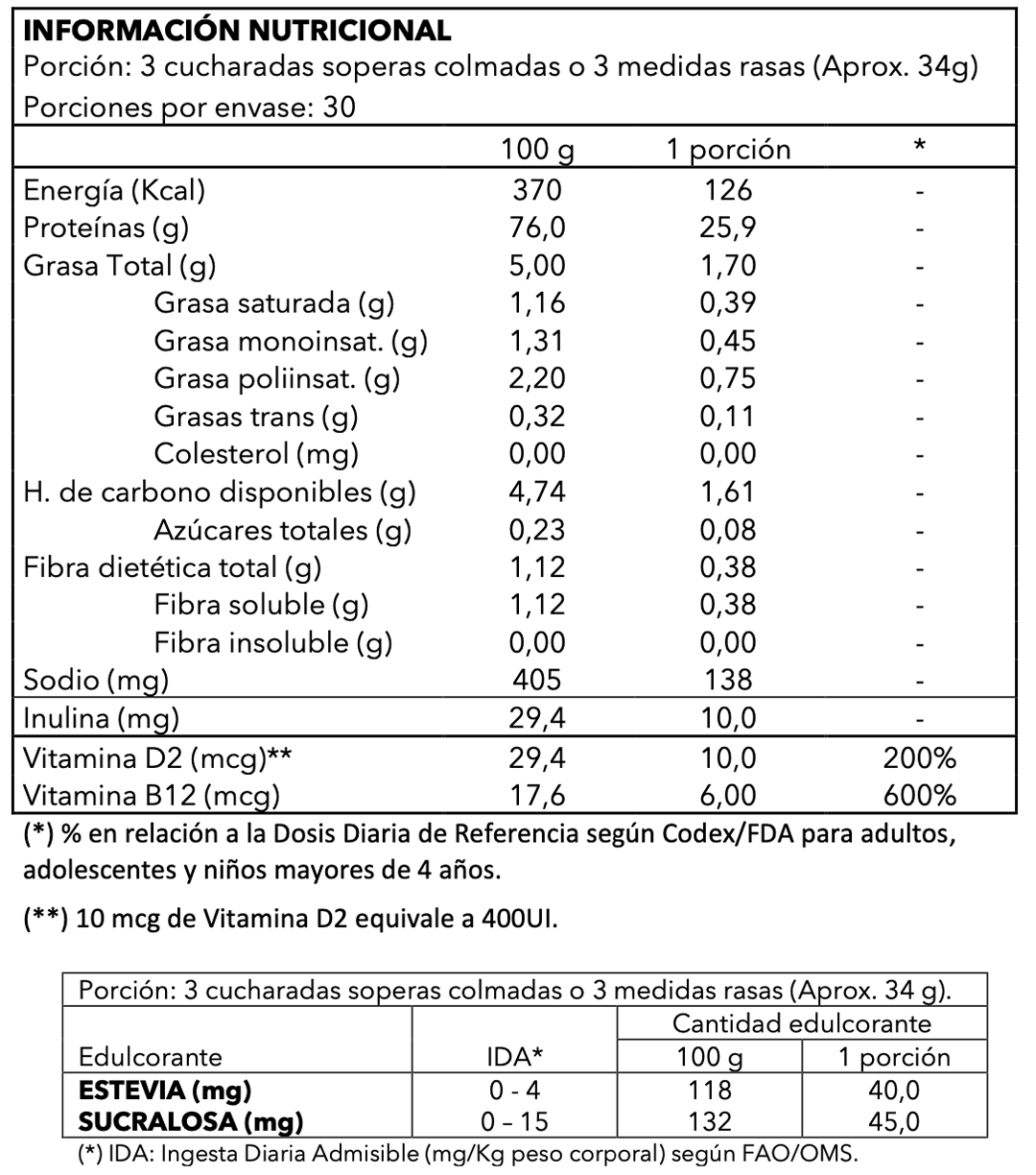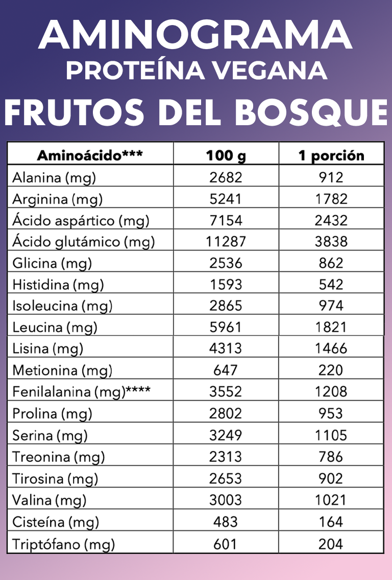 | Berries naturales en formato 500g. 25,6g de proteína vegetal por porción con prebióticos e inulina para tu salud digestiva. Sabor: Frutos del bosque. Berry intenso en formato conveniente. ¿Qué la hace diferente? Nuestra proteína vegana es un mix proteico de arveja y soya que entrega un perfil de aminoácidos completo, similar al de proteínas de origen animal. Cada porción aporta 25,6g de proteína, viene enriquecida con vitaminas B12 y D2 (esenciales en dietas plant-based), y contiene inulina como prebiótico natural para apoyar tu salud digestiva. Libre de sellos, sin azúcar añadida, sin gluten, sin lactosa, libre de GMO y baja en sodio. Endulzada con stevia y sucralosa, con saborizante 100% natural. Información nutricional Formato: 500g | Porciones por envase: ~15 | Porción: 34g (1 scoop) | Proteína por porción: 25,6g Ingredientes: Proteína de Arveja, Aislado de Proteína de Soya, Dióxido de Silicio Amorfo, Saborizante Natural, Stevia, Sucralosa, Inulina (Cichorium intybus L.), Cianocobalamina (Vitamina B12), Ergocalciferol (Vitamina D2) Modo de preparación Disolver 1 porción (34g) en 300-450 ml de agua, leche vegetal u otro líquido a elección. Agitar hasta obtener una mezcla homogénea. Consumir inmediatamente. Incluye: 1 frasco N°5 reutilizable y reciclable de proteína vegana 500g sabor Frutos del Bosque + 1 scoop medidor. Sobre The Good Vegan Somos una marca chilena de suplementos alimenticios 100% veganos, de la Quinta Región. Elaboramos nuestros productos con ingredientes de origen vegetal, sin comprometer sabor ni rendimiento. Todos nuestros lotes cuentan con análisis de laboratorio y aminogramas publicados en nuestra sección de documentación. Despachos a todo Chile los días lunes, miércoles y viernes en compras realizadas hasta las 12:00 hrs. |